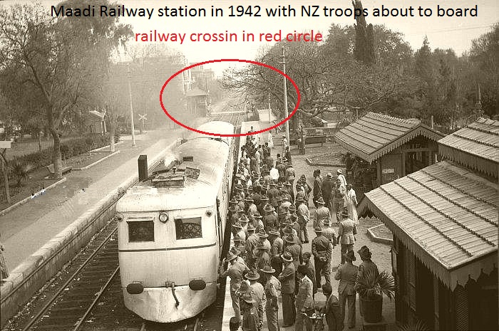 1951 photo taken by Chief Engineer Lamei Elmotei from the second floor window of EDLICO showing the Maadi railway crossing on Fouad al-Awal (later Nahda) Avenue. EDLICO's British manager's car seen about to cross into Maadi once departing train to Helwan leaves Maadi railway station. The railway's mechanical junction exchange kiosk is seen on the Maadi side of the railway. (photo courtesy Sami L. Elmotei)