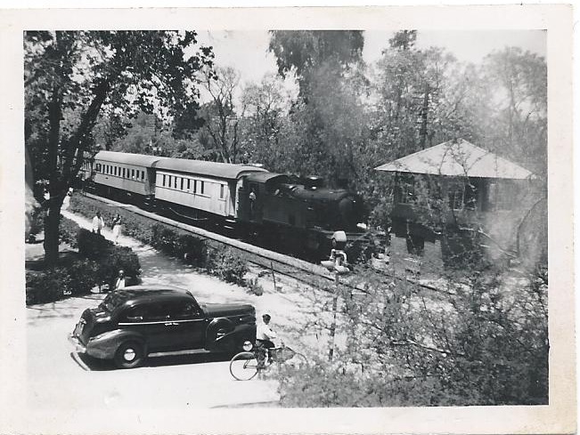 1951 photo taken by Chief Engineer Lamei Elmotei from the second floor window of EDLICO showing the Maadi railway crossing on Fouad al-Awal (later Nahda) Avenue. EDLICO's British manager's car seen about to cross into Maadi once departing train to Helwan leaves Maadi railway station. The railway's mechanical junction exchange kiosk is seen on the Maadi side of the railway. (photo courtesy Sami L. Elmotei)